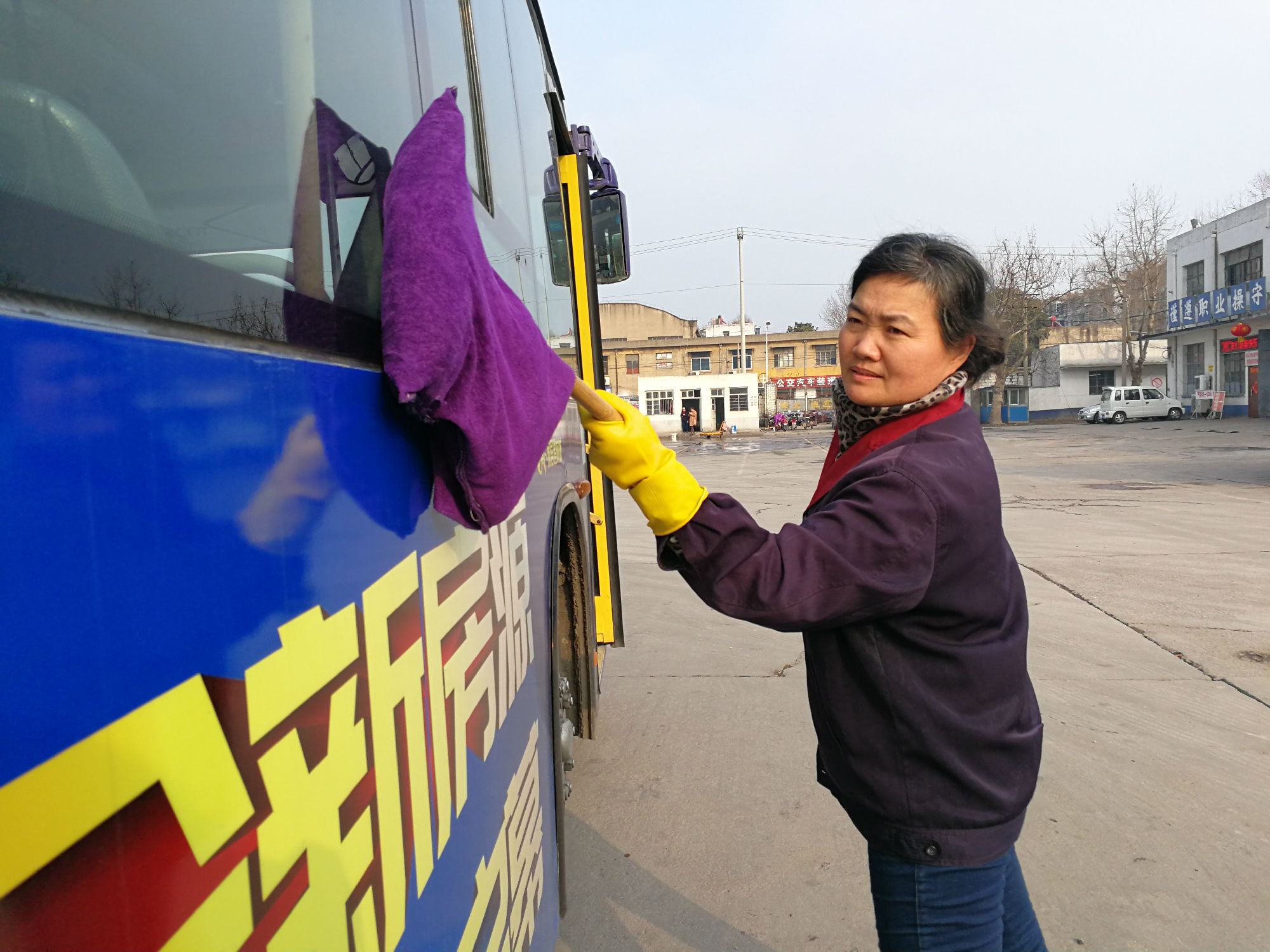 清晨5點,74路保潔員韓黎明已經來到韓山車場,開始保潔車輛。由于氣溫較低,車場內的水龍頭凍壞了,無法正常使用,她只好到遠一點的地方,將水一桶桶的運來,開始細心地擦拭玻璃,車輛外圍,車內座椅、內圍板....不放過一處角落。冬天的水冰涼刺骨,清洗抹布的手凍得通紅,搓搓手、跺跺腳,她又賣力的干了起來。車窗玻璃上厚厚的霜十分難擦,加上道路上經常遇到灑水車,跑完一圈回來車身又臟了,增加了車輛保潔難度。韓黎明不怕辛苦,任勞任怨,只要有臟的地方,她就再次清潔,確保出場的每輛車都干干凈凈。期間,她的衣服多次被汗水浸透,晾晾汗,又凍得發(fā)抖,韓黎明沒有抱怨,仍然堅守完成自己的工作。