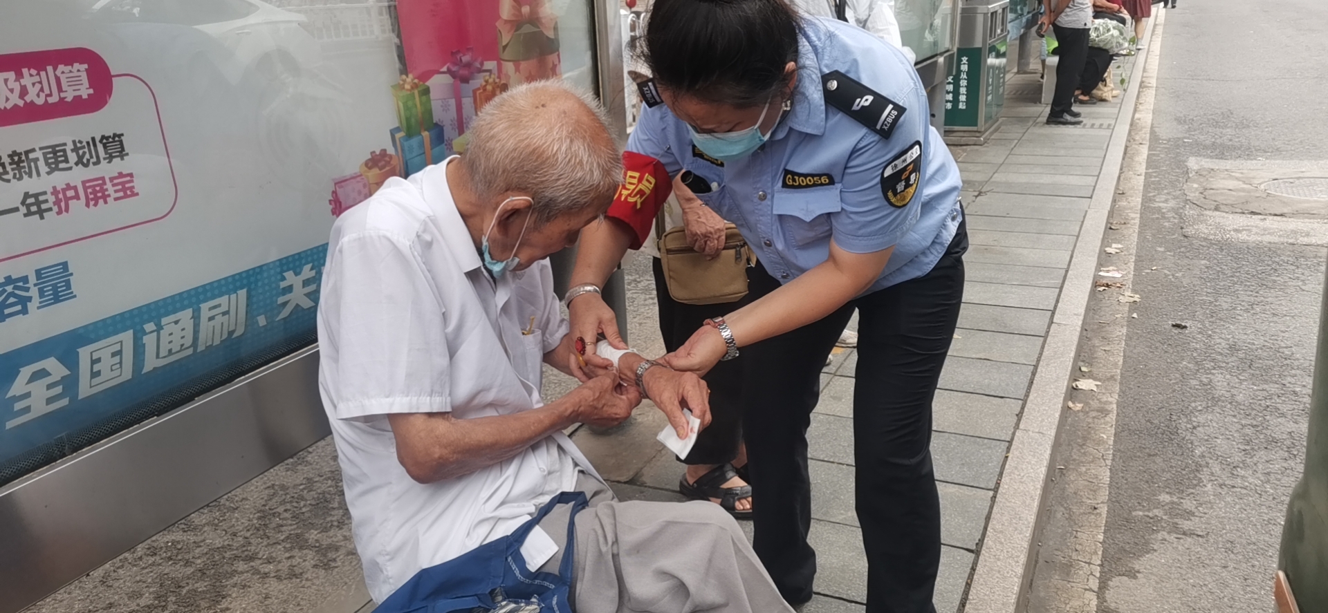 8月2日上午8時(shí)許,公交督導(dǎo)員孫琪在朝陽站開展站臺(tái)執(zhí)勤工作時(shí),突然聽到有人大喊:“快來救一下,有人摔倒了!”孫琪當(dāng)即上前查看情況,發(fā)現(xiàn)一位老人癱坐在站臺(tái)上,不停地喘著粗氣,胳膊上有一個(gè)大傷口,鮮血直流。
