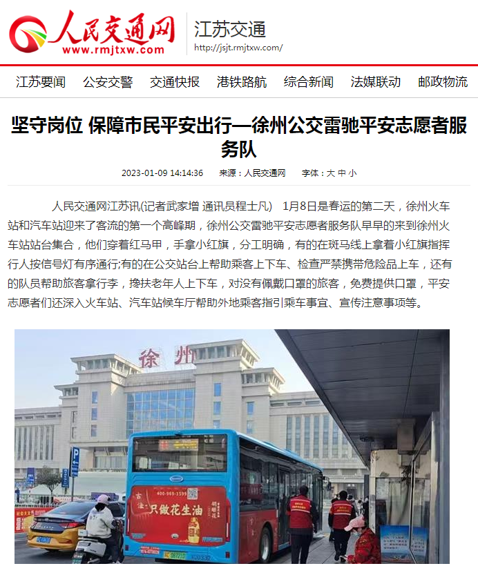 1月9日,人民交通網(wǎng)刊發(fā)文章《堅守崗位 保障市民平安出行—徐州公交雷馳平安志愿者服務(wù)隊》