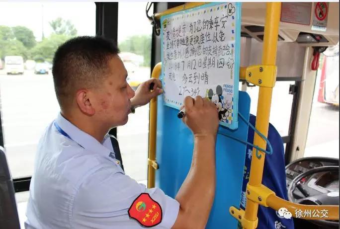 原來他已養(yǎng)成了習(xí)慣,在他的駕駛室后方掛著一塊白板,寫著乘車的溫馨提示語和天氣情況。每天他都會記錄下當天的天氣情況:“為了您的乘車安全,請不要隨意更換座位。感謝您的支持!2018年7月12日星期四,多云到晴,27~34攝氏度”,“特別是老年人、孩子,開車時換位子太危險了?!毖λ山忉尩?。